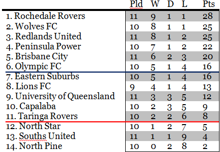 The draw sees Power drop to 8 points behind leaders Rochedale, albeit with a game in hand. Lions FC are knocking on the door, now only three points behind 6th placed Olympic and with a game in hand.
